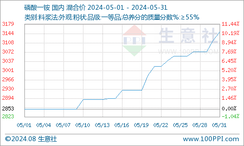 是2853元/吨,5月31日国内55%粉状一铵市场均价是3150元/吨,本月磷酸一铵市场价格上涨10.4%。