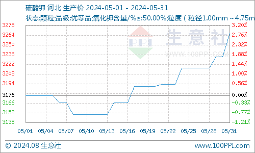 据生意社商品行情分析系统监测:本月初硫酸钾含量50%价格为3176元/吨,本月末硫酸钾含量50%价格为3264元/吨,价格上涨2.76%。