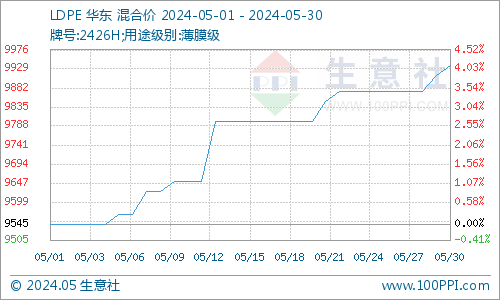 据生意社商品行情分析系统监测,LDPE(2426H)5月1日国内价格在9545元/吨,5月30日均价在9937元/吨,期间报价上涨幅度4.11%。