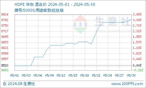 据生意社商品行情分析系统监测,HDPE(5000S)5月1日国内价格在8520元/吨,5月30日均价在8787元/吨,期间报价上涨幅度3.14%。