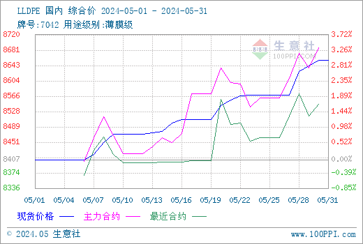 据生意社商品行情分析系统监测,LLDPE(7042)5月1日国内价格在8407元/吨,5月30日均价在8655元/吨,期间报价上涨幅度2.96%。