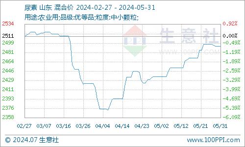 下游相关产品尿素来看,本周(5.27-31),尿素市场止涨企稳,价格变动不大,据生意社商品行情分析系统,国内尿素跌幅在0.17%。截止本周五山东地区中小颗粒主流报价在2300-2350元/吨。供需保持基本平衡为主。供需保持合理平衡,一方面,供应端检修企业偏多,山东、河南、山西等地不断有装置短期停机,产量回升比较缓慢。另一方面,下游刚需补货持续。复合肥生产推进,华中、华东农用备肥采购偏多,需求旺季余温仍未褪去。支撑尿素价格维持相对较高水平。尿素厂家出货量在高位,普遍挺价为主。
