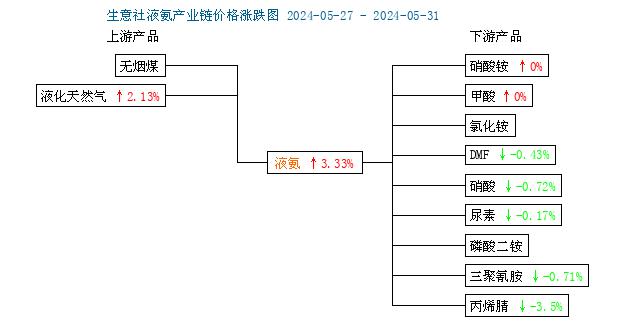 从液氨产业链图来看,上游成本面也有利好,液化天然气本周价格走升,涨幅在2.13%。但下游产品仍表现偏弱,这主要表现在下游需求中规中矩,农业需求旺季逐渐过去;另外,工业需求维持刚需为主。主要下游产品尿素本周止涨回稳。复合肥板块也不温不火,氯化铵、硝酸铵、磷酸二铵等产品均没有突破。