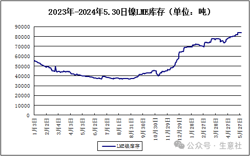 据上图所示,5月份,LME镍库存小幅上涨,截止月末,LME镍库存83730吨,较月初上涨6.63%,较年初上涨30.51%。