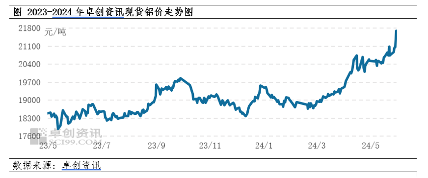 2024年5月,国内现货铝价持续高位攀升,重心不断上移。经历了2023年相对平稳的走势,铝价在今年一季度末迎来突破,二季度表现同样亮眼。其中5月30日铝价突破21500元/吨大关,并刷新2022年4月中旬以来低位。据卓创资讯统计数据显示,5月月均价为20742元/吨,环比上涨511元/吨,涨幅为2.53%,同比去年同期上涨2438元/吨,涨幅为13.32%。