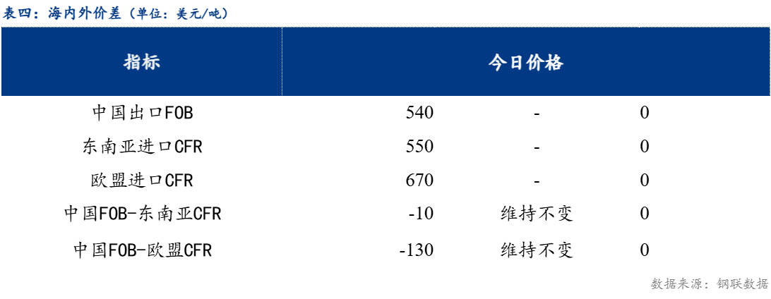 从区域价差来看,华东与东北价差100元/吨,较上一交易日维持不变;华东与华南价差20元/吨,较上一交易日维持不变;华南与华北价差50元/吨,较上一交易日正向缩小10元/吨。