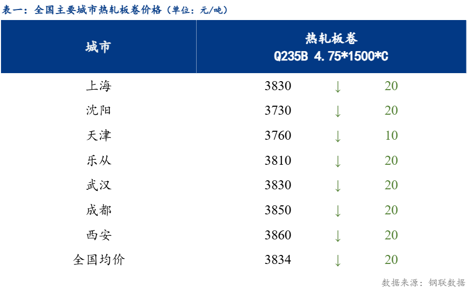 今日热轧板卷全国主要城市价格小幅下跌,截止发稿时3.0mm热轧板卷全国均价3895元/吨,较上一交易日下跌20元/吨;4.75mm热轧板卷全国均价3834元/吨,较上一交易日下跌20元/吨。分区域来看,全国各区域普遍下行,基本波动幅度在10-30元/吨左右。今日黑色商品期货震荡下行,现货市场早盘低开后持续走弱,午后盘面震荡弱势运行,部分市场价格继续下跌,成交转淡。目前市场成交一般,原料价格逐步下行,成品材跟跌,市场情绪开始转弱,成交冷淡。目前供给基本维持高位,库存有所增库,终端需求按需采购为主。