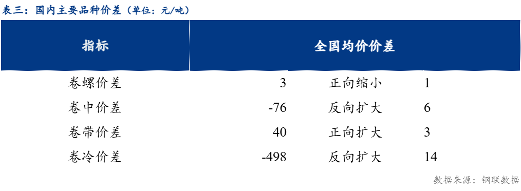 从品种价差来看,卷螺差较上一交易日正向缩小1元/吨,热中价差较上一交易日反向扩大6元/吨,热带价差较上一交易日正向扩大3元/吨,热冷价差较上一交易日正向扩大14元/吨。