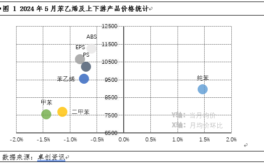 2024年5月份苯乙烯及上下游产品价格涨跌互现,其中仅上游纯苯月均价实现上涨,截至5月30日,纯苯月均价环比上涨1.47%;苯乙烯及下游三S月均价均环比下滑,跌幅均集中在0.5%-1%之间。