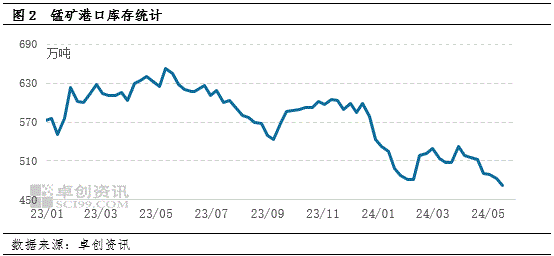 从下面图中可看出,当前港口库存数量处于近两年低位,截至5月中旬,天津港进口锰矿库存约352万吨,周环比下滑2.24%,其中主因澳矿到港量减少。尽管GEMCO计划从6月开始恢复采矿活动,但预计初期产量将受限,锰矿问题仍是市场关注焦点。