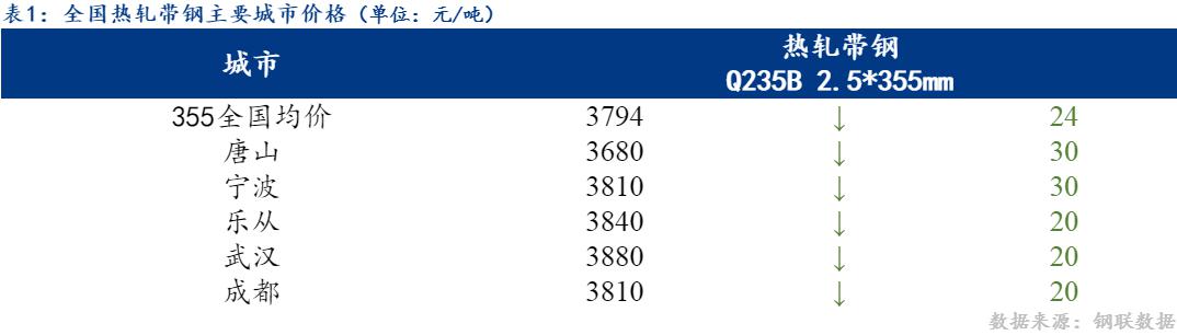 31日热轧带钢全国主要城市价格小幅下调,截至发稿时2.5*355mm热轧带钢均价3794元/吨,较昨下降24元/吨,其中2.5*355mm主要城市报价为唐山3680元/吨,宁波3810元/吨,乐从3840元/吨。