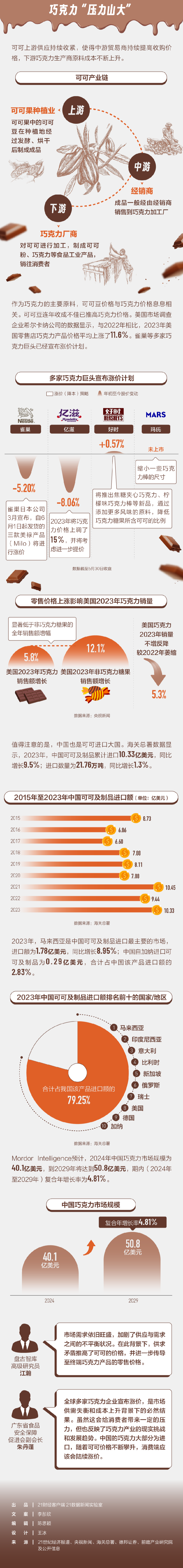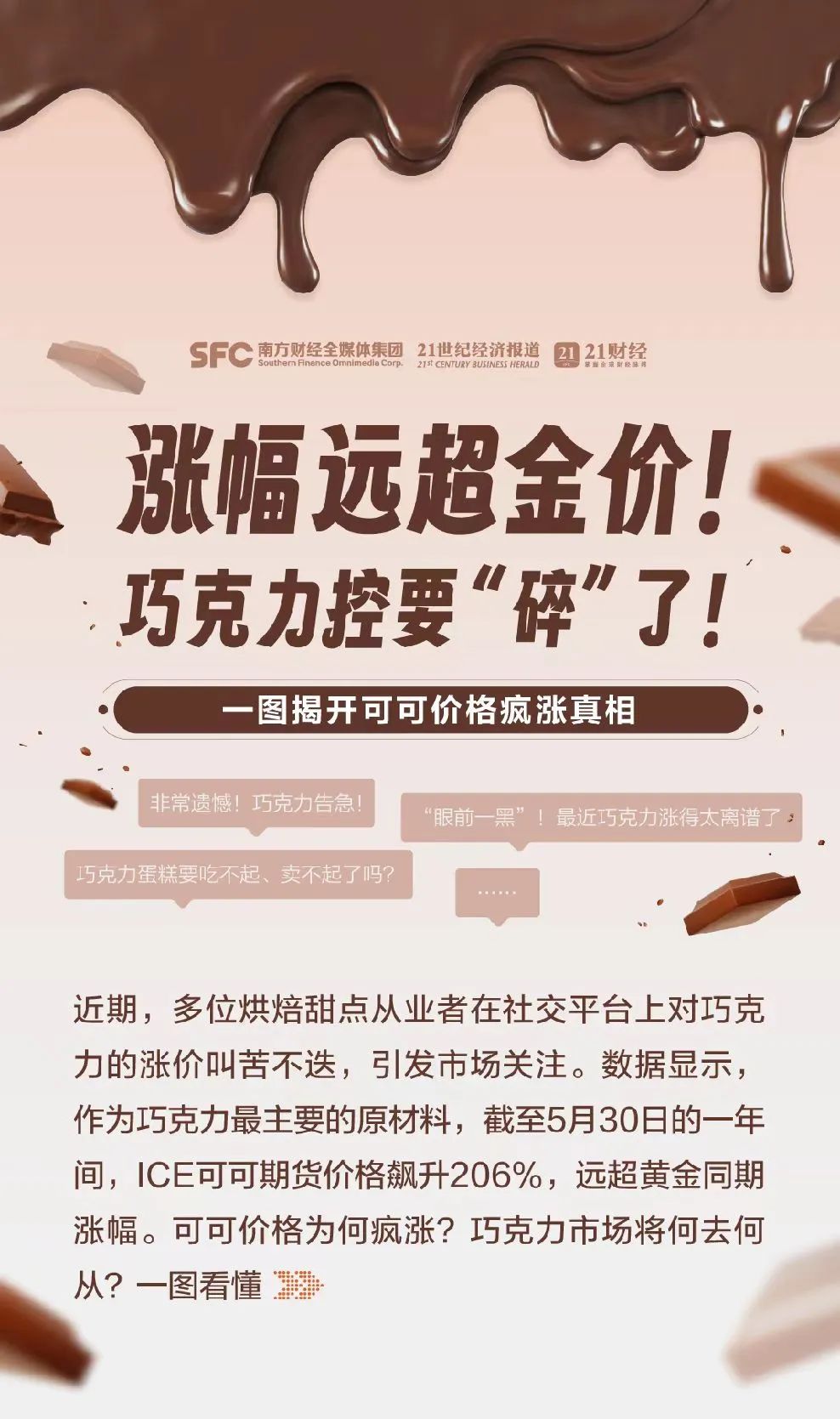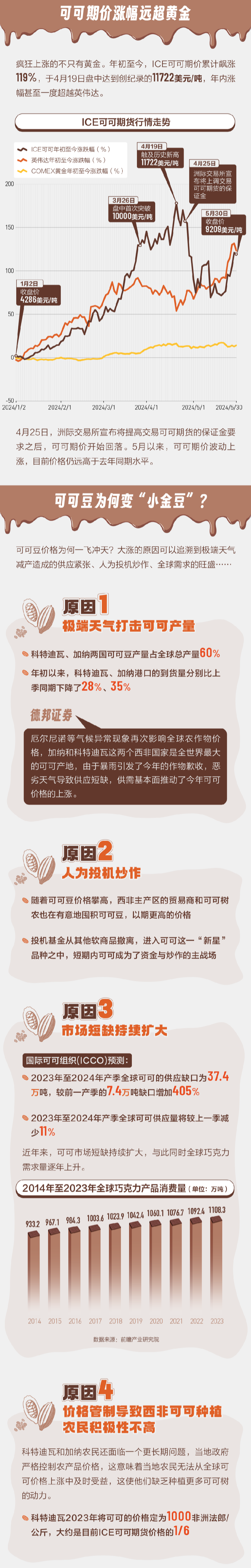 近期,多位烘焙甜点从业者在社交平台上对巧克力的涨价叫苦不迭,引发市场关注。数据显示,作为巧克力最主要的原材料,截至5月30日的一年间,ICE可可期货价格飙升两倍,远超黄金同期涨幅。可可价格为何大涨?巧克力市场将何去何从?一图看懂>>
