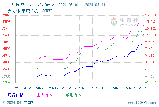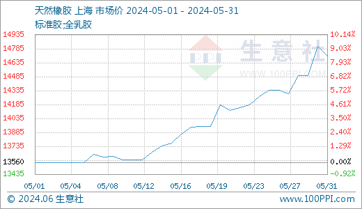 据生意社商品行情分析系统,5月份国内天然橡胶走势持续上涨,我国天然橡胶市场现货胶行情5月31日在14710元/吨左右,5月1日在13560元/吨左右,涨幅8.48%。5月最高价位出现在5月30日14710元/吨左右,最低价为5月1日的13560元/吨,最大振幅9.22%。