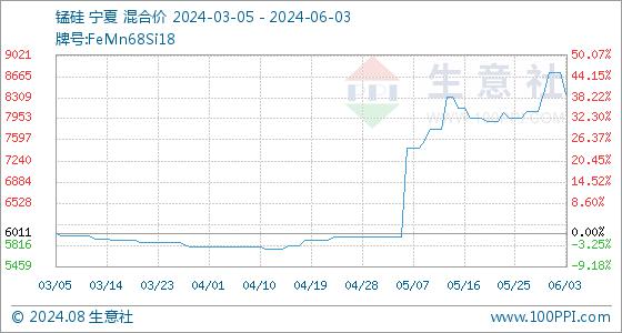 6月3日,生意社锰硅基准价为8725.00元/吨,与本月初持平。