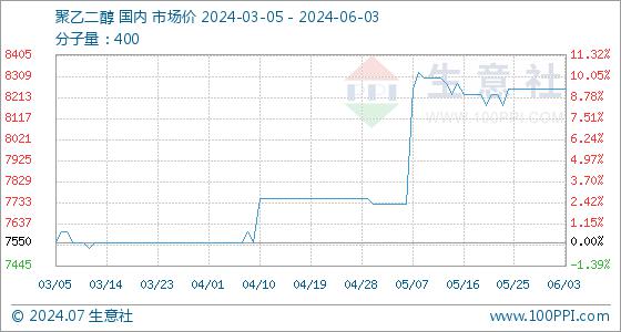 6月3日,生意社聚乙二醇基准价为8250.00元/吨,与本月初持平。