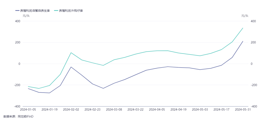 与此同时,外购仔猪养殖利润也实现了大幅提升。同期外购仔猪养殖利润为盈利335.54元/头,相较于5月24日的204.15元/头。