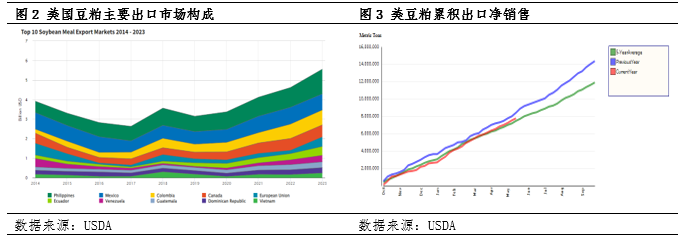 美豆压榨利润改善空间有限。美国农业部发布的压榨周报显示,截至2024年5月24日的一周,美国大豆压榨利润为每蒲2.15美元,比前一周增长8.0%。作为参考,2023年的压榨利润平均为3.29美元/蒲。由于阿根廷上年度减产影响,美豆粕22/23年度出口规模创1330万吨历史记录,对菲律宾、越南以及欧盟的出口占比进一步提升,成为带动上年度美豆压榨产能持续释放的重要驱动力。