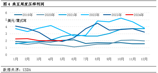 进入2024年,由于豆油及豆粕价格的下跌,压榨利润下滑明显,其中豆粕价格的走弱影响更加显著。随着4月以来美豆粕市场需求改善,累计净销售规模逐步好于过去五年均值水平,价格回升带动美豆压榨利润好转,但相较于上年度平均盈利水平仍有较大差距。结合当前美国内畜禽养殖需求以及国际市场豆粕出口竞争优势来看,一是其国内生猪及肉牛养殖的蛋白饲料消费或受畜产品价格高位回落影响受到抑制,二是南美大豆即将收获以及阿根廷产量恢复,或将对此前美豆粕出口市场形成挤占,预计美豆压榨利润的改善空间也相对有限。