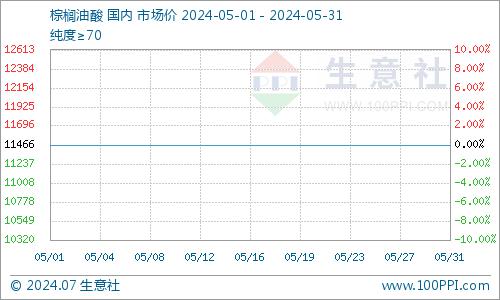 据生意社商品行情分析系统监测,本月棕榈油酸持稳运行,截至5月31日国内棕榈油酸(纯度≥70)主流价格在11466.67元/吨,价格较上周持平,较4月1日上涨0.29%。