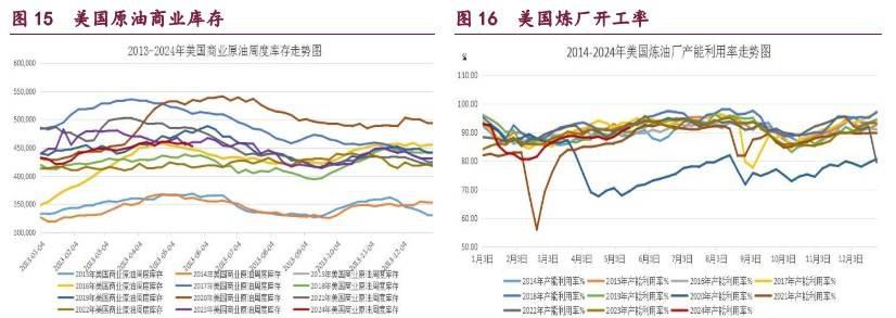 截止 2024 年 5 月 24 日当周,美国商业原油库存达4.52355 亿桶。比前一周减少 649 万桶;炼油厂开工率 92.2%,比前一周增长0.5 个百分点。备受关注的美国俄克拉荷马州库欣地区原油库存 3632 万桶,减少170.9 万桶。过去的一周,美国石油战略储备 3.69304 亿桶,增加了50 万桶。