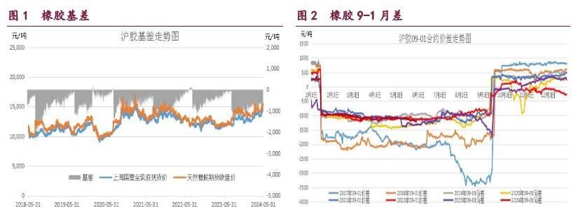 本周五国内沪胶期货2409 合约呈现缩量减仓,弱势下行,回吐此前涨幅的走势,盘中期价重心大幅下移至15350 元/吨一线运行。收盘时期价小幅收低 1.82%至 15350 元/吨。9-1 月差贴水幅度略微收敛至 1180 元/吨。由于海外东南亚地区旱情因素限制,供应预期被延后,下游需求依然尚佳,预计后市沪胶期货2409 合约维持震荡整理的走势。