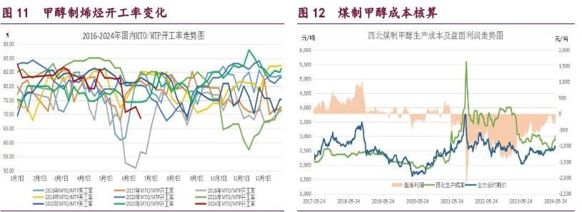 截止 2024 年 5 月 31 日当周,国内甲醛开工率维持在29.74%,周环比略微回落 0.01%。同时二甲醚方面,开工率维持在 16.67%,周环比小幅增长0.94%。醋酸开工率维持在 87.04%,周环比小幅回落 1.33%。MTBE 开工率维持在53.32%,周环比小幅增加 1.56%。截止 2024 年 5 月 31 日当周,国内煤(甲醇)制烯烃装置平均开工负荷在 68.59%,周环比小幅下降 4.08%。截止2024 年5 月31日,国内甲醇制烯烃期货盘面利润为-90 元/吨,周环比小幅回落45 元/吨。