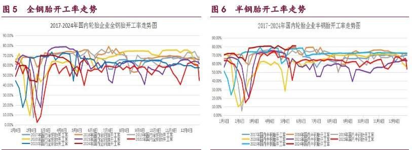 截止 2024 年 5 月 31 日当周,山东地区轮胎企业全钢胎开工负荷为60.90%,周环比小幅回落 5.20 个百分点,同比小幅下降 5.44 个百分点。国内轮胎企业半钢胎开工负荷为 80.60%,周环比略微回落 0.20 个百分点,同比小幅回升3.17个百分点。