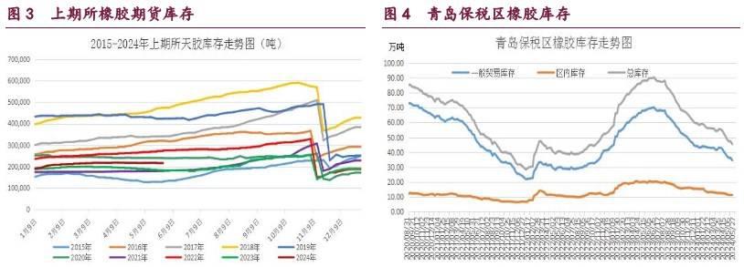 截至 5 月 24 日当周,青岛地区天然橡胶一般贸易库库存为33.98 万吨,较上期减少 0.56 万吨,降幅 1.62%。天然橡胶青岛保税区区内库存为10.41万吨,较上期减少了 0.41 万吨,降幅 3.79%。二者库存合计达44.39 万吨,周环比小幅下降 0.97 万吨,连续第九周下滑。