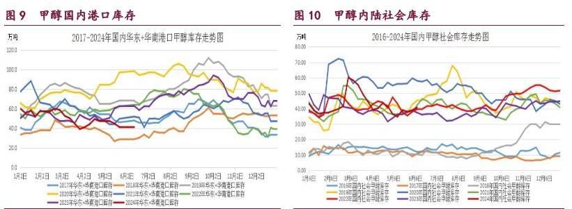 截止 2024 年 5 月 31 日当周,我国华东和华南地区的港口甲醇库存量维持在 42.58 万吨,周环比小幅增加 1.38 万吨,月环比小幅下降4.67 万吨,较去年同期大幅减少 15.78 万吨。其中华东港口甲醇库存达28.28 万吨,周环比小幅减少 3.52 万吨,华南港口甲醇库存达 14.30 万吨,周环比小幅增加4.90万吨。截至 2024 年 5 月 30 日当周,我国内陆甲醇库存合计达40.72 万吨,周环比小幅回升 1.78 万吨,月环比小幅增加 6.04 万吨,较年初小幅下降0.9万吨。