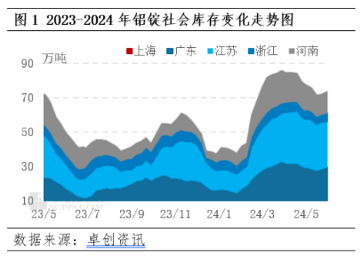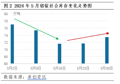 【导语】2024年5月,铝锭社会库存呈现由去化到累库的走势。月内高铝价对需求抑制作用难减,下游规模加工厂需求平稳,中小型需求偏差,社会库存仍处于去年同期高位水平。后市云南继续复产,产能产量稳步攀升,而需求端逐渐向消费淡季过渡,预计6月铝锭社会库存或将增加。