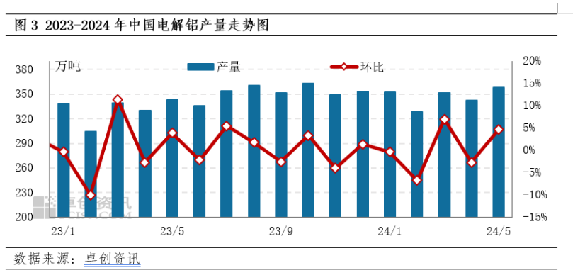 产量方面:卓创资讯监测数据显示,2024年5月份全国电解铝冶炼企业总产量为358.23万吨,较上月增加16.11万吨,增幅为4.71%;较去年同期增加15.24万吨,增幅为4.44%。其中产量增量主要来自云南当前已复产的产能。
