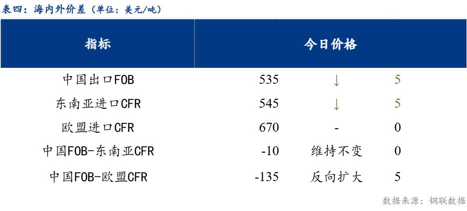 从海内外价差情况来看,中国热卷出口在535美元/吨,较上一交易日下跌5美元/吨;欧盟进口价格670美元/吨,较上一交易日持平。