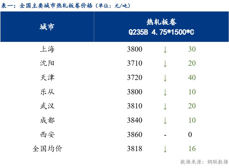 截止发稿时4.75热轧板卷全国均价3818元/吨,较上一交易日下跌16元/吨。其中主要城市价格为上海3800元/吨,沈阳3710元/吨,天津3720元/吨,乐从3800元/吨,武汉3810元/吨,成都3840元/吨,西安3860元/吨。