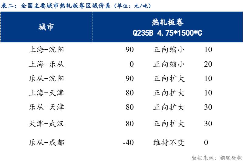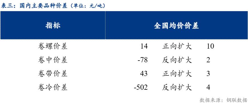 从品种价差来看,卷螺差较上一交易日正向扩大10元/吨,热中价差较上一交易日反向扩大2元/吨,热带价差较上一交易日正向扩大3元/吨,热冷价差较上一交易日反向扩大4元/吨 。