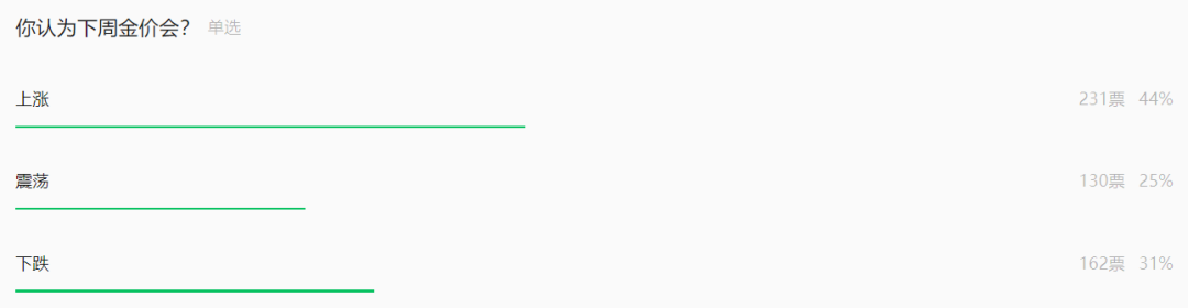 5月27日当周,伦敦金开盘2335.79美元/盎司,最高2364.08美元/盎司,最低2320.53美元/盎司。北京黄金经济发展研究中心调查显示,市场人士认为本周国际金价偏空可能性较高。投票显示,有44%的读者看涨本周金价、25%看震荡、31%看空。