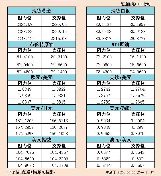 6月3日美市支撑阻力:金银原油+美元指数等六大货币对