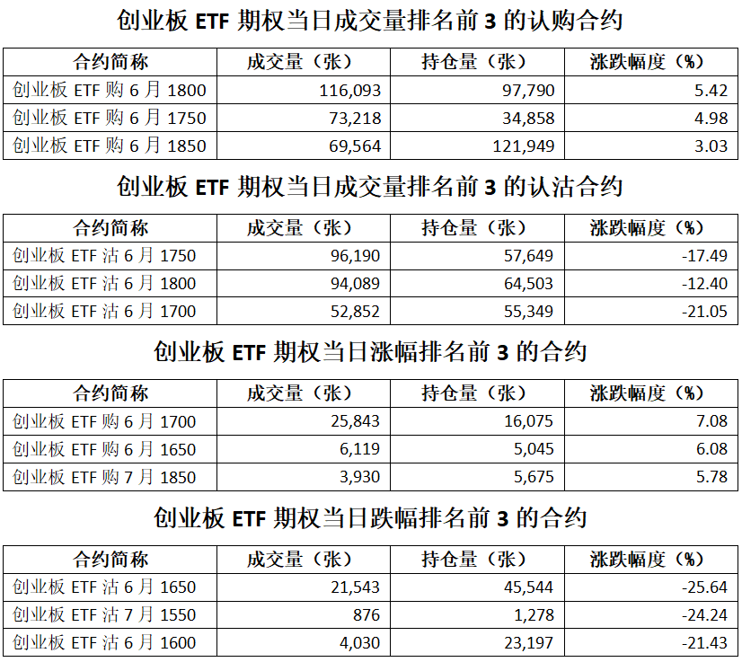 创业板ETF期权总成交面额133.70亿元,增加26.34%,期现成交比为0.25,权利金成交额2.83亿元;期权总成交量748,208张,增加27.00%,其中认购期权成交量376,143张,认沽期权成交量372,065张,认沽认购成交比率为0.99(上一交易日认沽认购成交比率为0.84)。