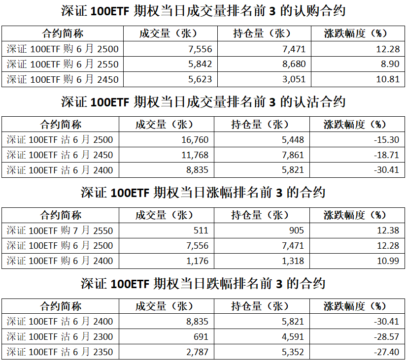 深证100ETF期权总成交面额20.75亿元,增加52.42%,期现成交比为0.02,权利金成交额0.29亿元;期权总成交量83,298张,增加52.03%,其中认购期权成交量33,114张,认沽期权成交量50,184张,认沽认购成交比率为1.52(上一交易日认沽认购成交比率为1.09)。
