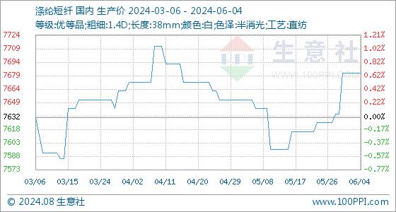 6月4日,生意社涤纶短纤基准价为7682.00元/吨,与本月初持平。