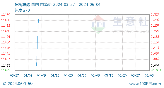 6月4日,生意社棕榈油酸基准价为11466.67元/吨,与本月初持平。