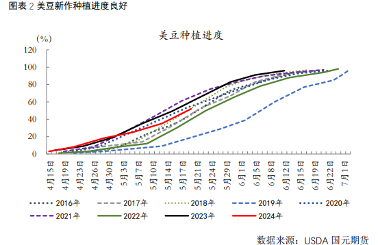 美国农业部作物进展周报显示,截至5月19日,美国大豆播种工作完成了52%,一周前为35%,上年同期为61%,五年均值为49%。大豆出苗率为26%,一周前16%,上年同期31%,五年均值为21%。