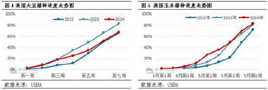 从目前美国大豆和玉米的播种数据看,暂时看不到减产的痕迹。截至5月26日,美豆播种进度68%,去年同期78%,五年均值63%;美国玉米播种进度83%,去年同期89%,五年均值82%。6月份美国农业部也将发布优良率数据,目前市场预期优良率数据利空价格,今年的丰产预期暂时看不到扭转迹象。