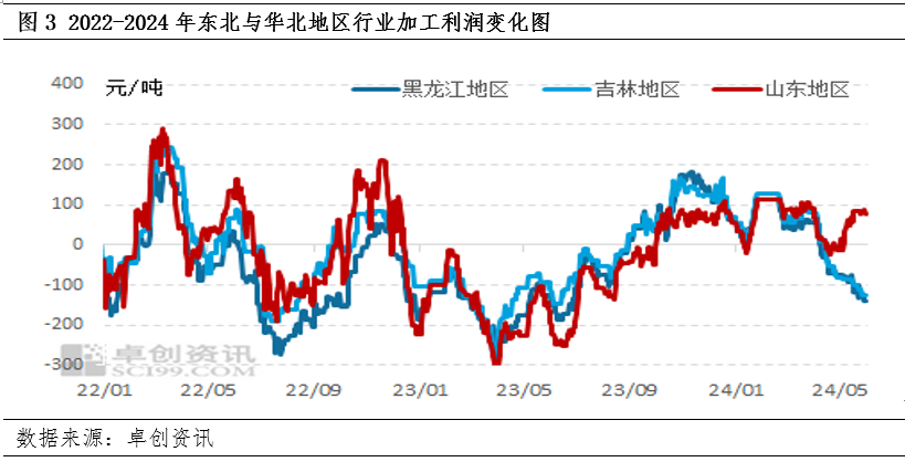 二、成本支撑力度强弱不同,东北与华北行业加工利润出现差异。