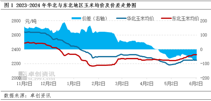 东北地区做为国内玉米的主要产区,产量占国内总产量的40%以上,当地玉米供过于求,大部分货源存在外流需求,虽然近年养殖与深加工企业纷纷在东北建立新产量,对区域内消费量有提振的作用,粮源留在当地的量逐年增加,但东北粮外流华北或者国内其他销区市场的需求依旧存在。今年自3月份以来,在政策收购提振、贸易商建库需求增加、自留当地粮源增多以及基层农户惜售等多重因素影响下,导致东北玉米价格坚挺运行。华北地区今年受区域内产量增加、养殖需求疲软及贸易商建库需求弱等因素影响下,当地玉米价格弱势运行,深加工企业玉米收购价格维持在2300-2350元/吨震荡。两者价格走势出现明显的差异,今年华北玉米价格明显低于东北玉米,东北与华北玉米价格发生错位,据卓创资讯数据显示,截止到6月3日东北与华北地区两地玉米均价倒挂幅度在72.86元/吨。
