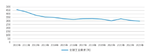 这种转化的步伐是缓慢的,但同时又是坚定的。从2010年到2023年的14年里,黄金的工业需求下滑了将近三分之一,从460多吨一路减少到不足300吨。同期全球黄金需求总量稳中有升,这意味着黄金的工业需求在总需求中所占的份额一路下降,从2010年的11%降至2023年的6.7%。