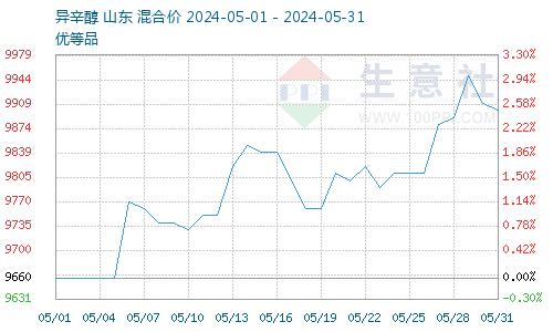 据生意社商品行情分析系统,截止5月31日,异辛醇报价9900元/吨,较5月1日异辛醇报价9660元/吨震荡上涨,涨幅2.48%。5月异辛醇价格处于市场底部,异辛醇价格下跌空间有限,国内异辛醇市场重心自4月中旬触底以来,异辛醇价格重心缓慢上移。从需求端来看,5月份下游增塑剂以及丙烯酸异辛酯装置轮流检修导致买盘持续性不高,异辛醇波动区间收窄。异辛醇市场缺少连续上行动力,异辛醇价格小幅震荡上涨。