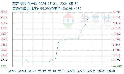 据生意社苯酐商品行情分析系统,截止5月31日,苯酐报价8187.50元/吨,较5月1日苯酐价格7720元/吨上涨,涨幅6.06%。原材料邻苯价格上涨,苯酐成本上涨;中下旬苯酐装置集中检修,其日度产能利用率已降至59%水平,苯酐供给减少,支撑苯酐价格上涨,增塑剂成本线小幅上行。