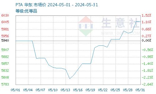 据生意社PTA商品行情分析系统,截止5月31日,PTA报价6010元/吨,较5月1日PTA价格5940.50元/吨先跌后涨,涨幅1.17%;较5月14日PTA价格5804元/吨震荡上涨,涨幅3.55%。PTA厂家检修较多,PTA供给减少;原材料放,国际市场PX厂家短停较多,PX供给紧缩,原材料上涨支撑较大,PTA成本支撑,PTA上涨支撑较大。