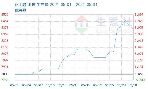 据生意社正丁醇商品行情分析系统,截止5月31日,正丁醇报价8366.67元/吨,较5月1日正丁醇价格7833.33元/吨上涨,涨幅6.81%。正丁醇供需偏弱,市场整体安静运行,上中旬部分下游小范围刚需补货,正丁醇市场重心小幅上行。正丁醇整体产能利用率变化不大,市场整体供应平稳,正丁醇市场交投气氛一般,正丁醇主力工厂出货稳定,正丁醇下游需求回暖,正丁醇价格震荡上涨。