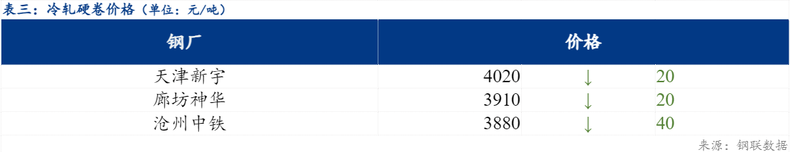 今日北方市场冷轧基料3.0*1010*CSPHC河北普阳价格为3770元/吨,较上一期价格下跌20元/吨,河北纵横价格为3700元/吨,较上一期价格下跌20元/吨。镀锌方面,今日北方地区部分下跌10-20元/吨;轧硬方面,今日冷轧硬卷价格下跌20-40元/吨。镀锌与冷轧基料价差490元/吨元/吨,价差较昨日反向缩小20元/吨,可见镀锌今日冷轧基料下跌幅度大。在市场方面,成交受期货大盘价格下降影响,市场成交延续清淡氛围。心态方面,库存压力尚存,贸易商对后市行情持谨慎心态看待,订货较为谨慎。